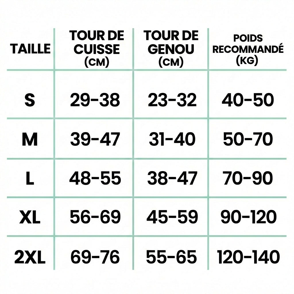 • Choisissez votre taille en fonction du tour de genou (mesuré au-dessus de la rotule) en vous référant au guide des tailles de la page produit.