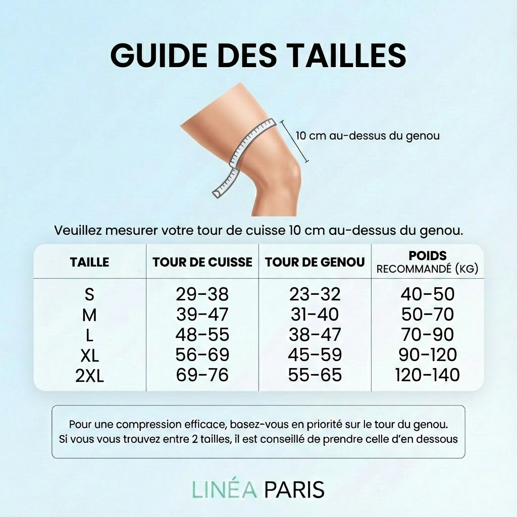 • Choisissez votre taille en fonction du tour de genou (mesuré au-dessus de la rotule) en vous référant au guide des tailles de la page produit.